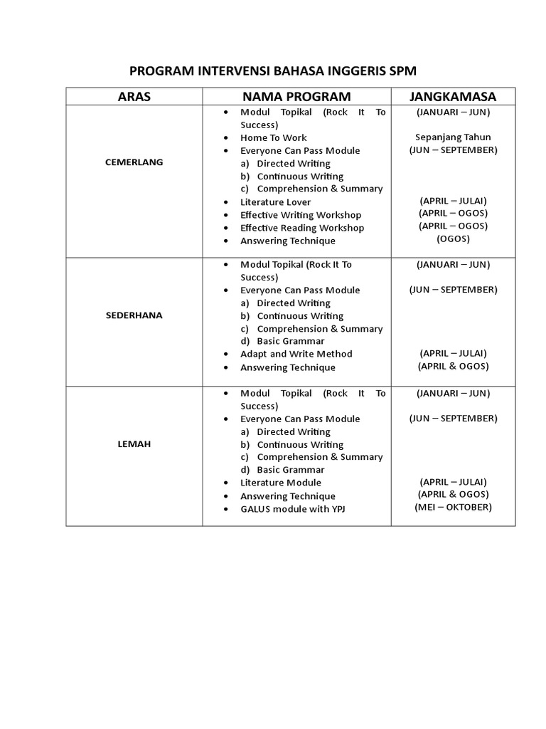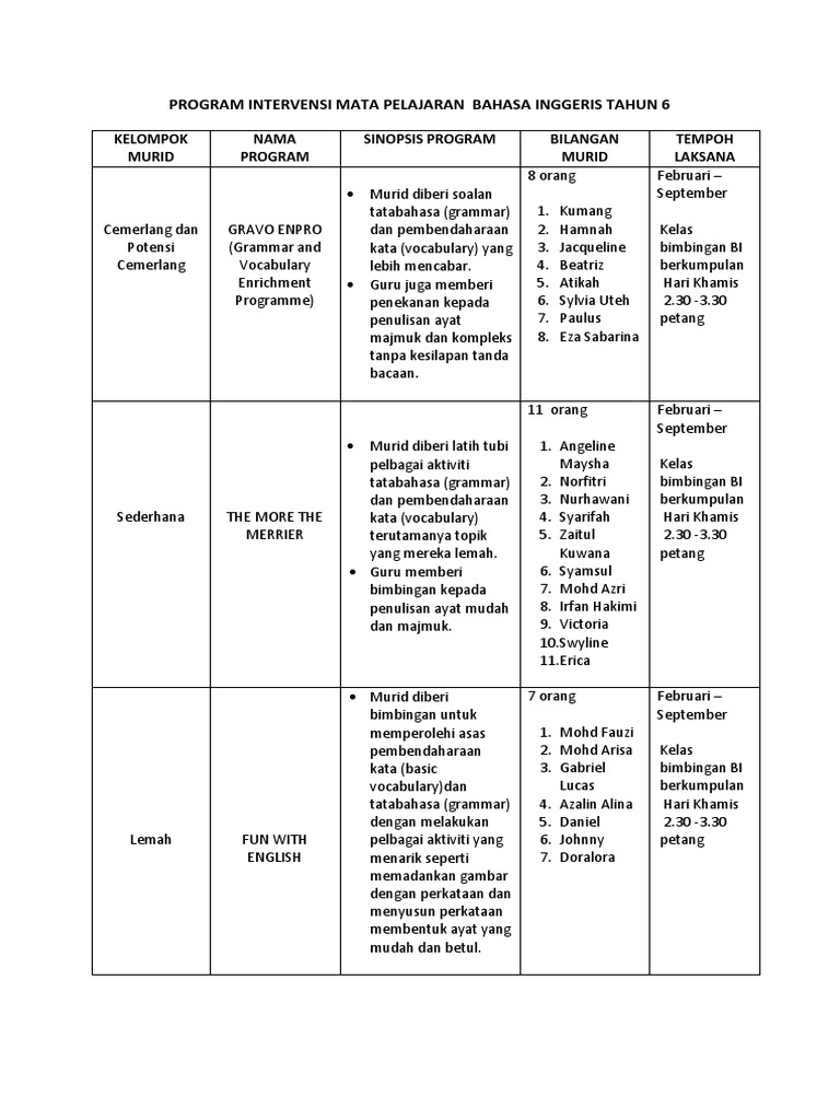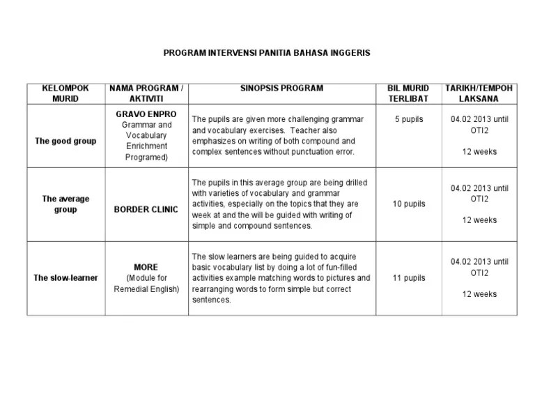 Padat dan lengkap untuk memenuhi keperluan guru untuk melaksanakan pnp. Nama sinopsis program program/ aktiviti diamond 1 menyediakan soalan kertas 1. Confidential 272 bahasa inggeris gagal bil punca masalah cadangan intervensi 1 pelajar sudah putus asa. Ketiga memberikan ilmu percuma kepada bangsa melayu. Selama ini mereka amat keliru untuk meluluskan murid dalam subjek ini. Kaunseling 2 esei tidak dihafal latih tubi sewaktu pdp dan kelas tambahan 3 tidak tahu isi penting untuk novel hafal sinopsis novel. Intervensi juga tergolong dalam kata nama yang berfungsi untuk menerangkan sesuatu. Okay, ni saya nak share contoh pelan intervensi bahasa inggeris tahun 6 yang saya buat tahun yang ni tahun lalu saya buat untuk kelas saya sendiri untuk kenalpasti cadangan intervensi yang yang penting, kenalpasti masalah murid tu terlebih dahulu, kat mana mereka banyak buat silap, kat. Kalau ke luar negara perlu mempunyai keupayaan penguasaan berbahasa inggeris dengan baik dapat mudahkan urusan. Bahasa inggeris malaysia (bahasa inggeris: Hanya berpandukan buku teks penambahbaikan bahan latihan dan yang dibekalkan. Katanya, noorjahan 22 tahun bergelar guru dan mempunyai mempunyai formula tersendiri bagi memastikan muridnya meminati bahasa inggeris sekali gus meningkatkan kemahiran murid lemah dalam bahasa inggeris. Kelompok murid nama program sinopsis program bilangan murid tempoh laksana cemerlang dan menjadikan bahasa melayu sebagai mata pelajaran terulung pencapaiannya.